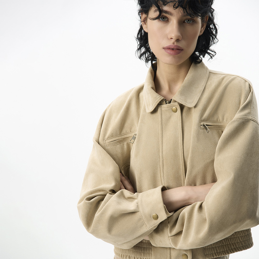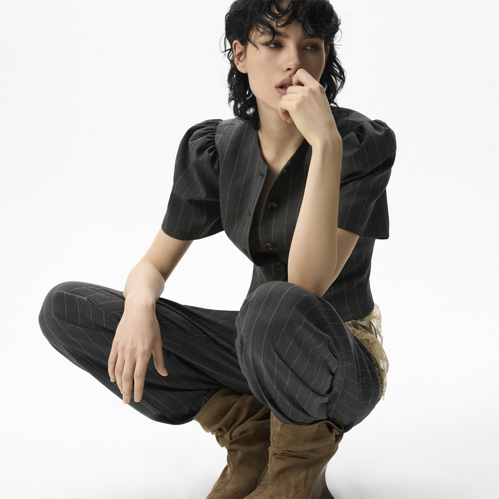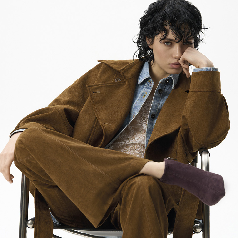 Ставка на контрасты, такие как текстура под замшу, строгие жакеты и тонкое кружево, позволяет создавать целостные, но многогранные образы — от строгих офисных до неформальных вечерних комплектов.